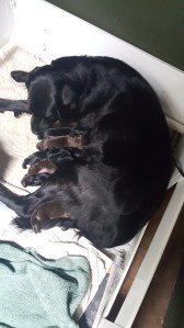 By 6.30pm the first puppy had arrived … and she kept going … until midnight. 10 beautiful puppies have now joined us, 6 liver in colour and 4 black. All look very well and Vesta is doing a great job as a mother. She is keeping me busy with food preparation: with so many puppies lots of freshly cooked chicken is de rigueur!